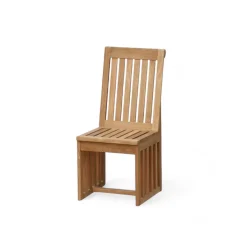 Teak wood dining chair with contoured seat and high back. Durable and weather-resistant. Suitable for indoor and outdoor use.