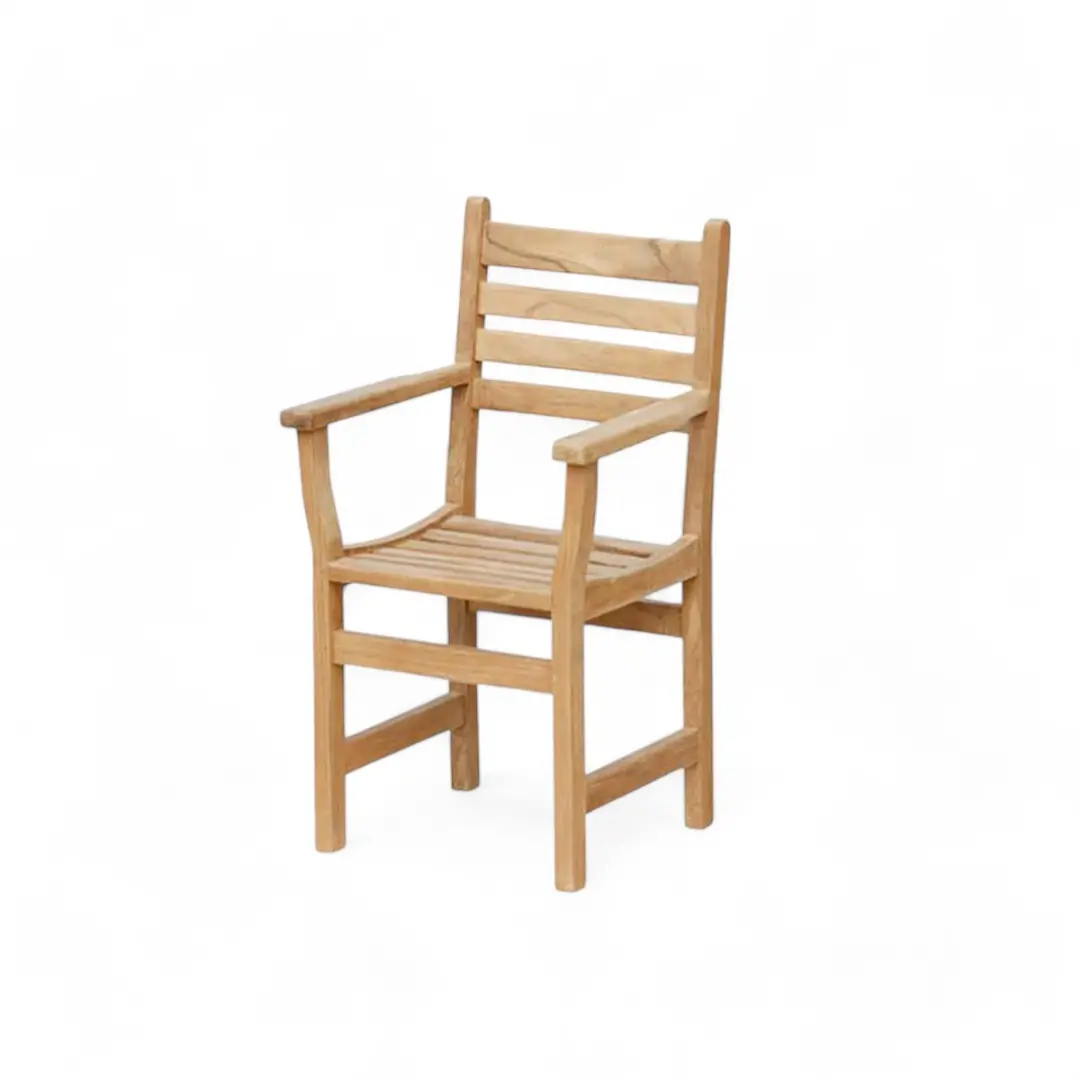 This classic teak wood armchair is a timeless addition to any dining space or patio. Crafted from high-quality teak wood, known for its exceptional durability and natural resistance to weather, this chair is suitable for both indoor and outdoor use. It features a comfortable design with a slatted seat and back, as well as supportive armrests. The warm wood tones and simple lines will complement a variety of décor styles. Enjoy its sturdiness and elegance for years to come. Assembly may be required.