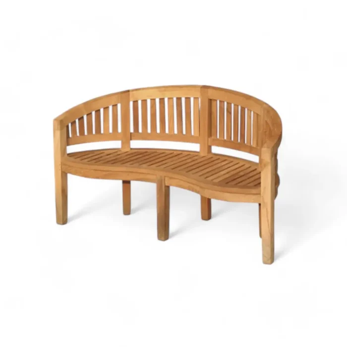 This curved teak wood bench is a beautiful and functional addition to any garden or patio. Crafted from high-quality teak wood renowned for its durability and natural weather resistance, this bench is designed to withstand the elements and provide lasting enjoyment. It features a gently curved design with a slatted seat and back for optimal comfort and support. The curved shape makes it perfect for creating a cozy conversation area or adding a touch of elegance to any outdoor setting. Assembly may be required.