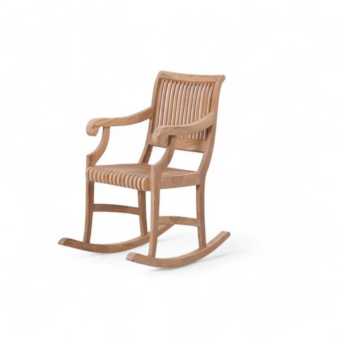 Teak wood rocking chair with curved back and armrests. Durable and weather-resistant. Suitable for indoor and outdoor use.