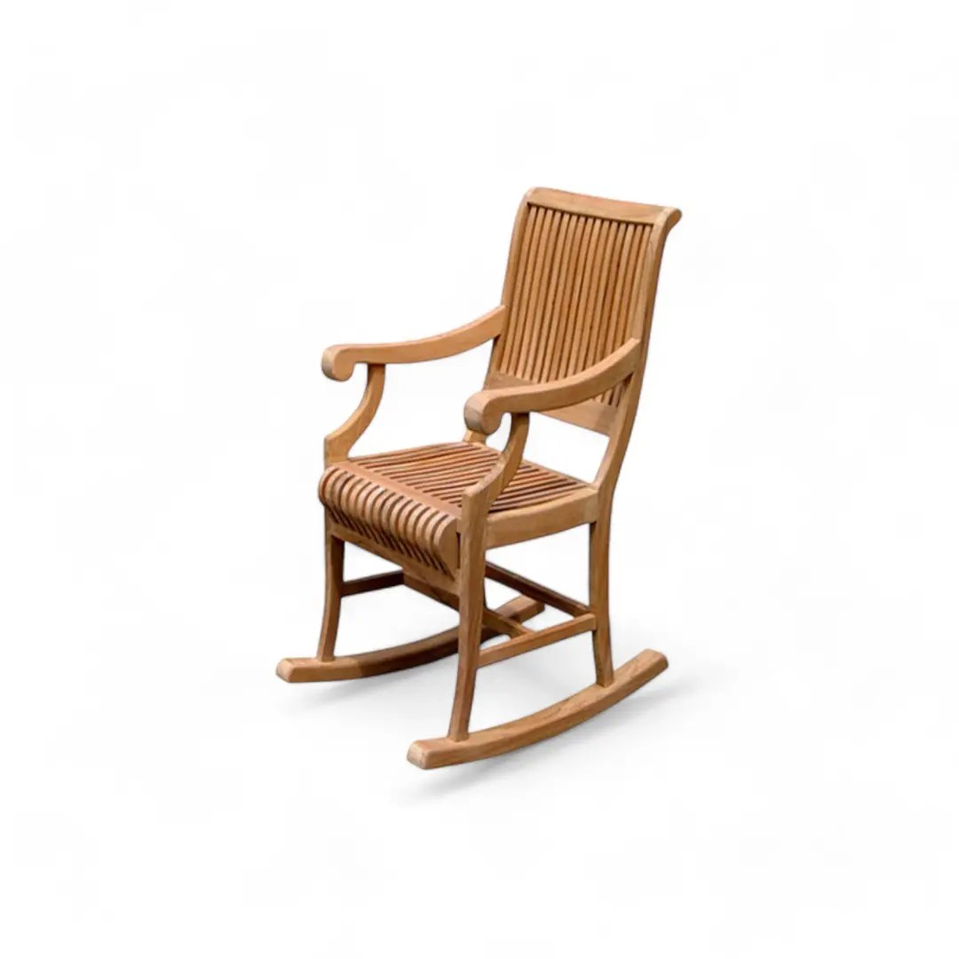 Teak wood rocking chair with curved back and armrests. Durable and weather-resistant. Suitable for indoor and outdoor use.