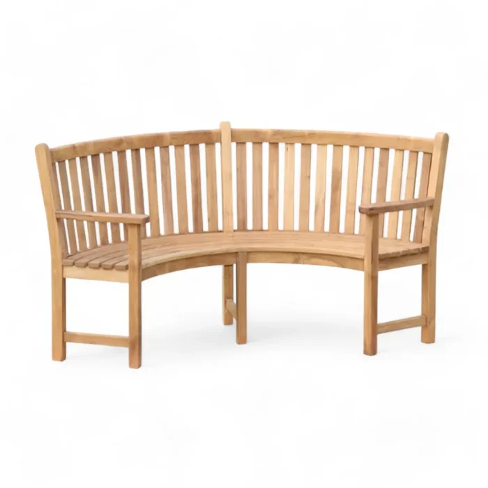 Curved teak wood bench. Durable and weather-resistant. Ideal for gardens and patios.