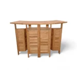 Elegant and functional teak wood bar unit with a curved countertop and ample storage. Perfect for indoor and outdoor entertaining.