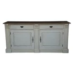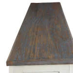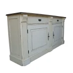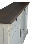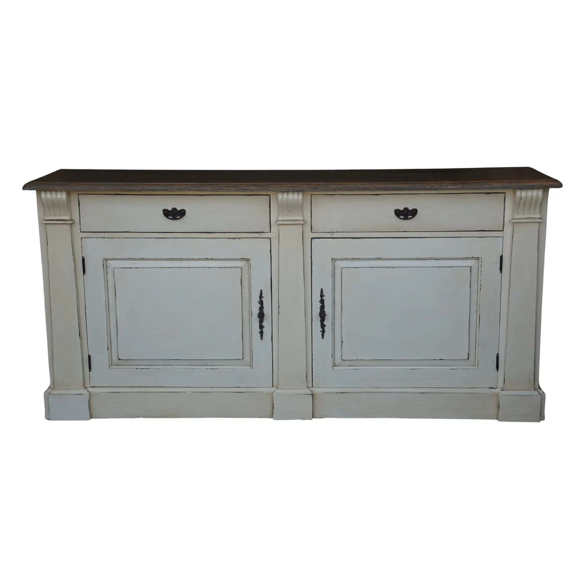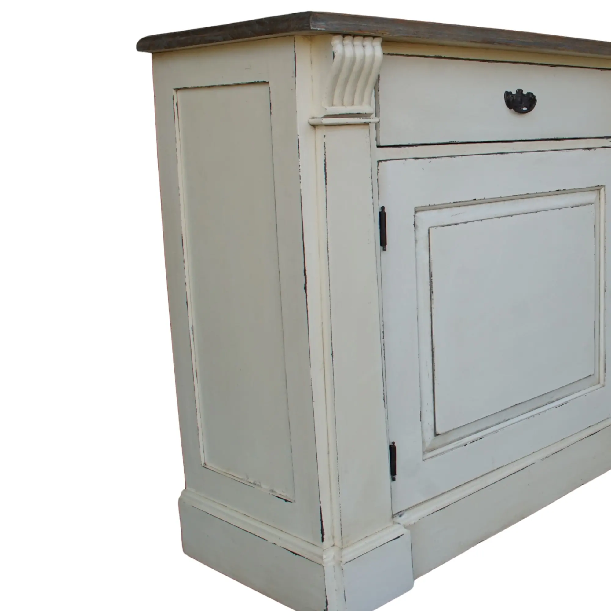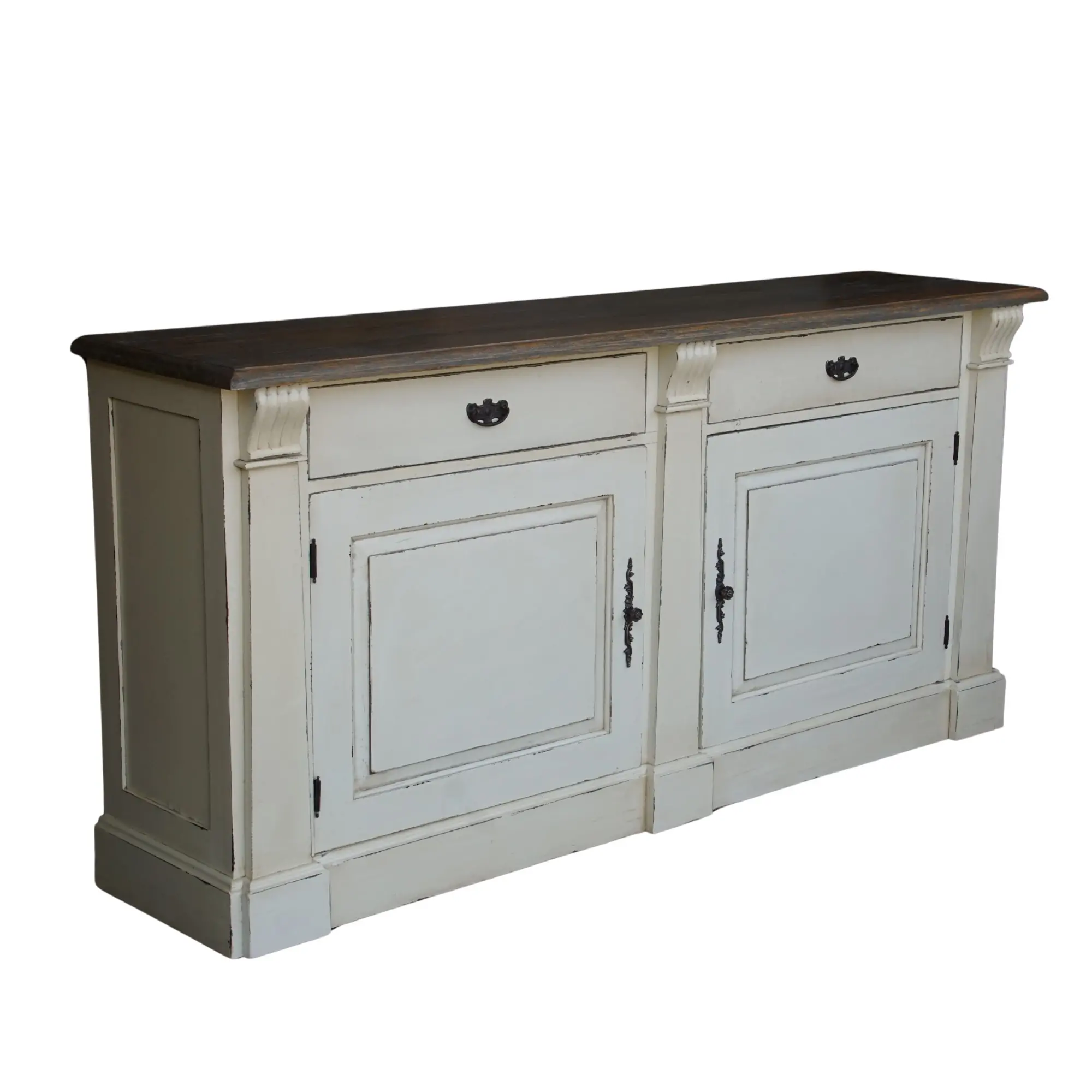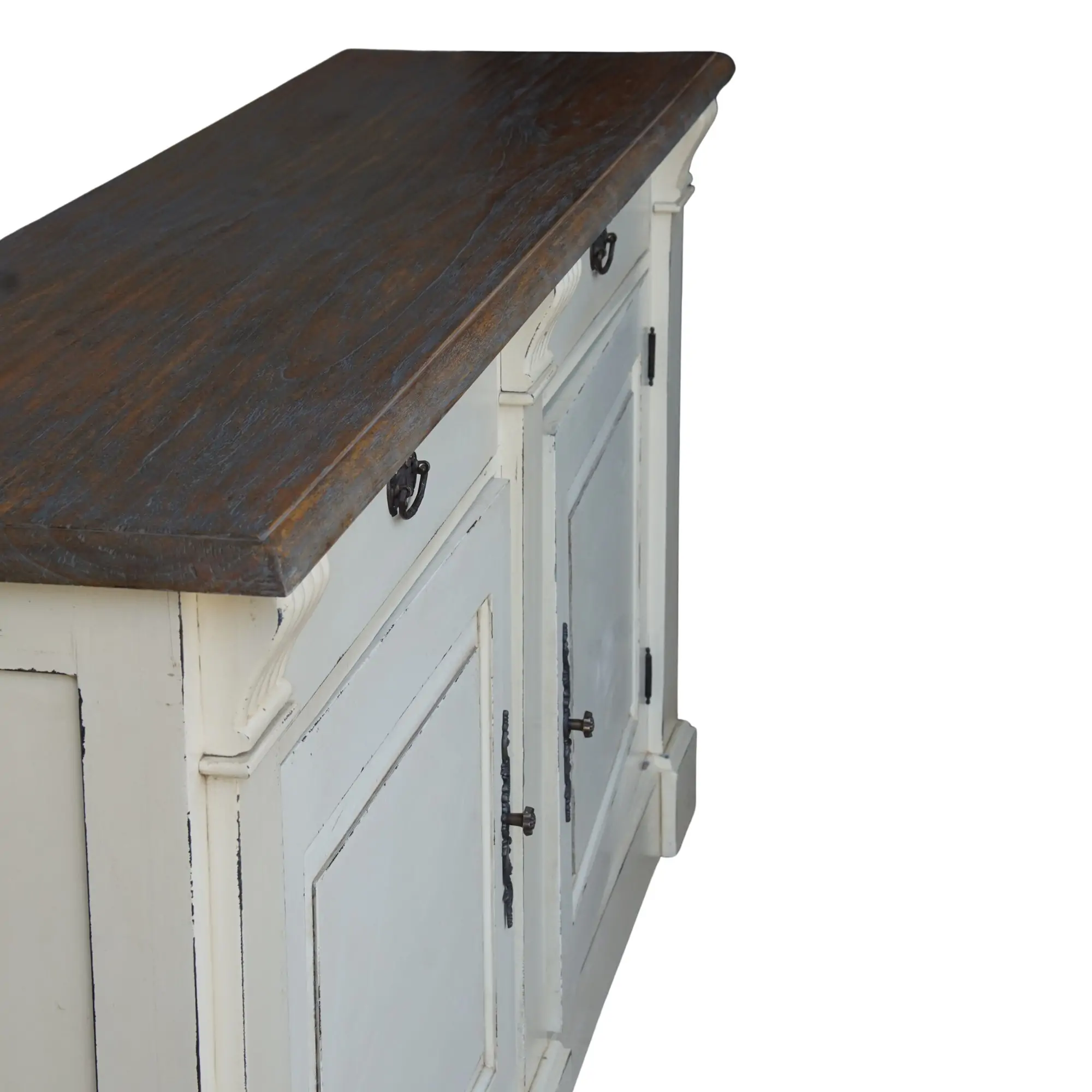 Elegant French Provincial style sideboard featuring a distressed white body, dark wood top, and antique detailing. Perfect as a buffet cabinet or console for classic rustic interiors.