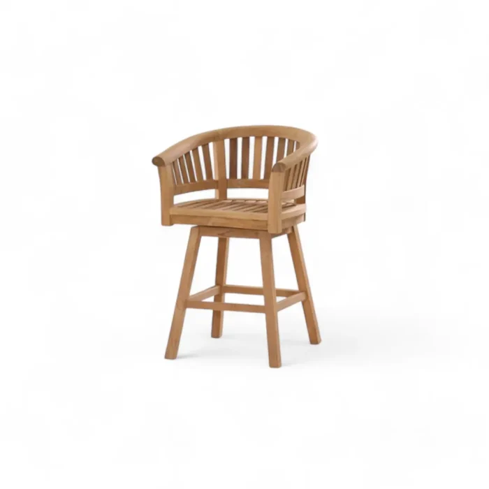 Comfortable and stylish teak wood swivel bar stool with a contoured seat and curved back. Perfect for indoor and outdoor use.