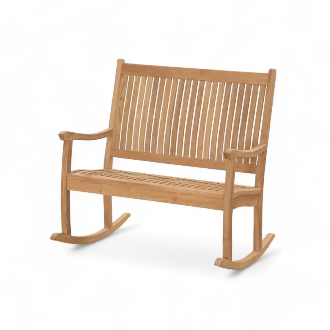 Teak wood rocking bench with high back. Durable and weather-resistant. Suitable for indoor and outdoor use.