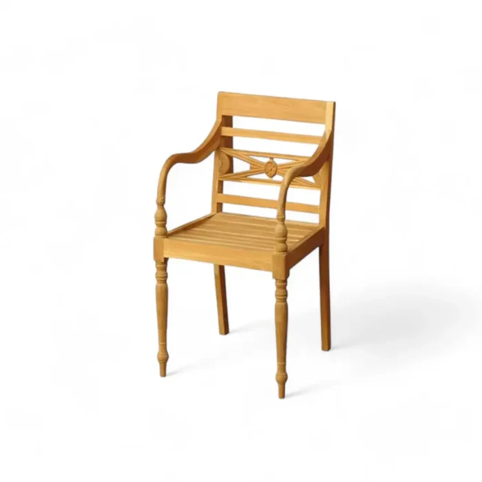 This elegant teak wood armchair is a perfect blend of classic design and enduring comfort. Crafted from high-quality teak wood renowned for its exceptional durability and natural resistance to the elements, this chair is suitable for both indoor and outdoor use. It features a distinctive design with a slatted seat, a high back with an ornamental carved motif, and gracefully curved armrests for added comfort and a touch of sophistication. The warm wood tones and timeless design will complement a variety of décor styles, from traditional to contemporary. Enjoy its sturdiness and elegance for years to come. Assembly may be required.