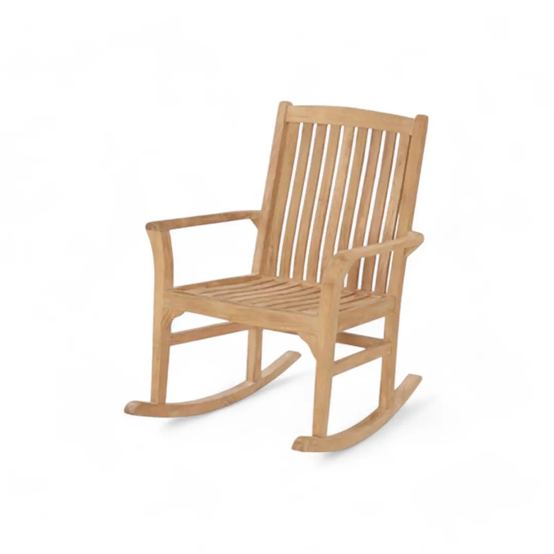 Teak wood rocking chair with high back. Durable and weather-resistant. Suitable for indoor and outdoor use.
