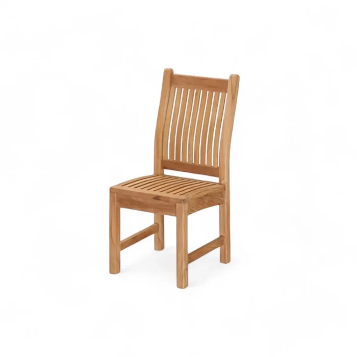 Teak wood dining chair with contoured seat and high back. Durable and weather-resistant. Suitable for indoor and outdoor use.