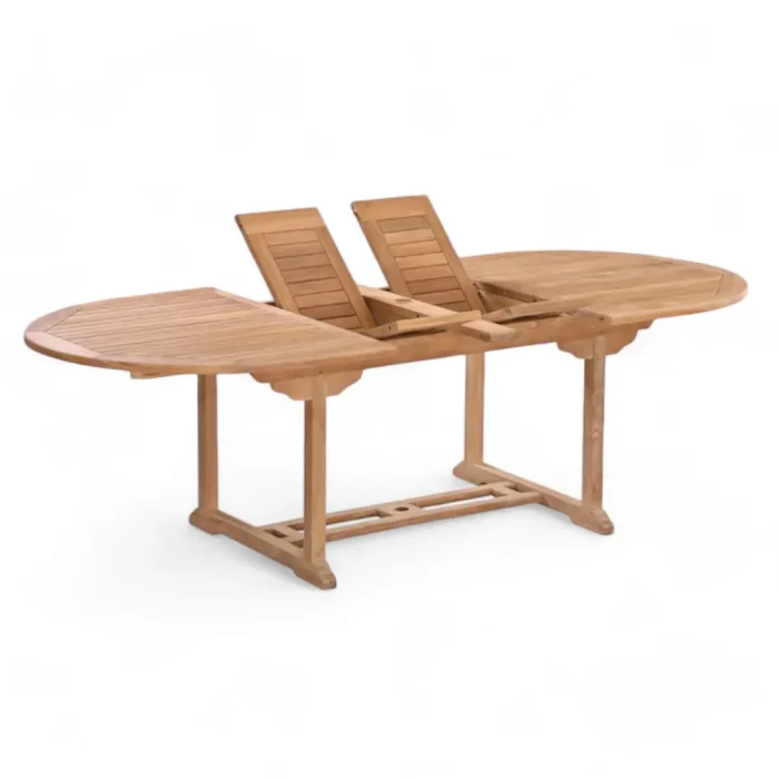 Host unforgettable gatherings with our Teak Wood Double Extending Oval Dining Table. Crafted from durable and weather-resistant teak wood, this table is built to last and endure the elements. Its unique double extending feature allows you to customize the table size to accommodate both intimate dinners and large parties with ease. The smooth oval tabletop and sturdy construction provide ample space and stability, making it a perfect centerpiece for your patio, garden, or any outdoor dining area.