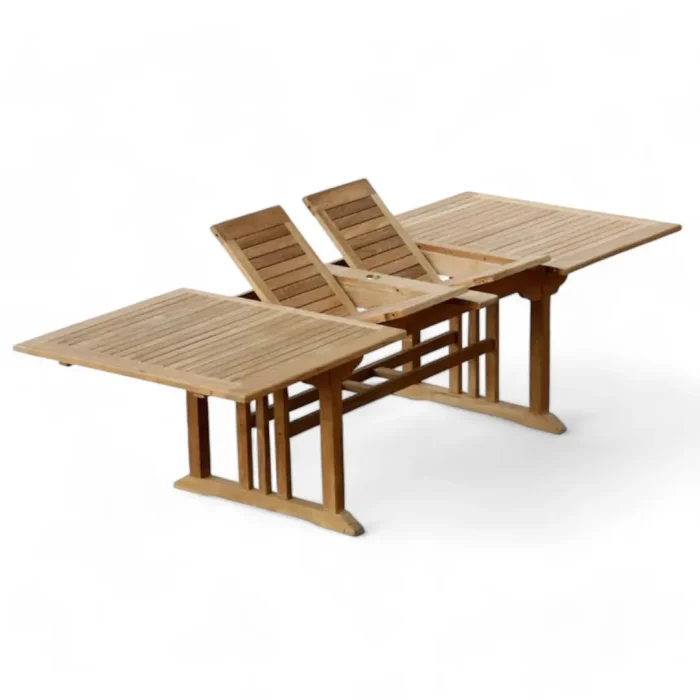 Enjoy versatile and spacious outdoor dining with our Teak Wood Double Extending Rectangular Dining Table. Expands easily to fit any occasion.