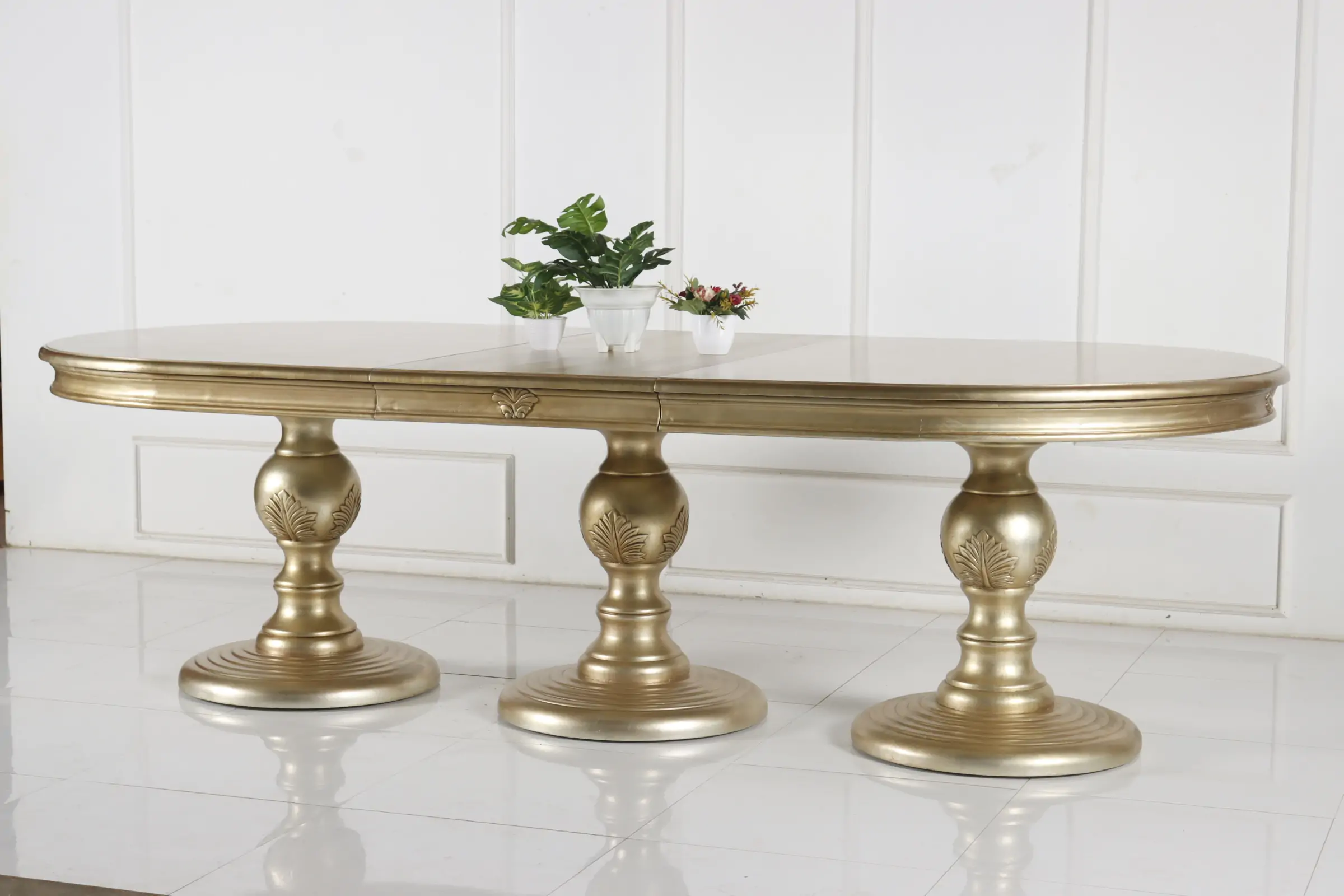 A grand extendable dining table featuring three pedestal bases and a luxurious gold finish. The Rhodes table brings antique European elegance and timeless craftsmanship to your dining space.