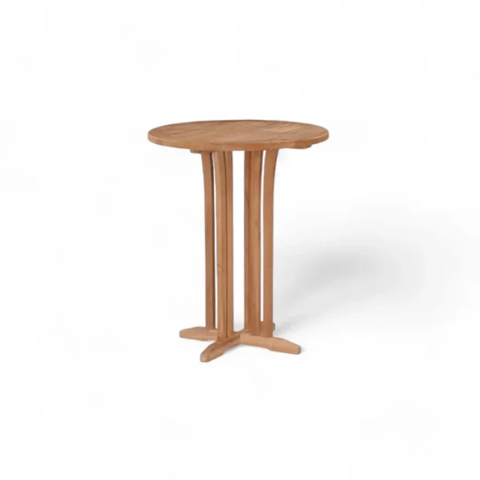 Durable and stylish teak wood bar table with a round top and sturdy pedestal base. Perfect for indoor or outdoor use.