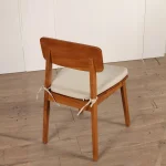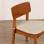 The softly upholstered beige fabric seat adds comfort and visual balance, making the chair suitable for long dining sessions while maintaining a minimalist and elegant appearance. The ergonomic backrest and sturdy teak frame ensure lasting support and stability.