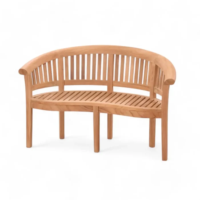 Curved teak wood bench. Durable and weather-resistant. Ideal for gardens and patios.