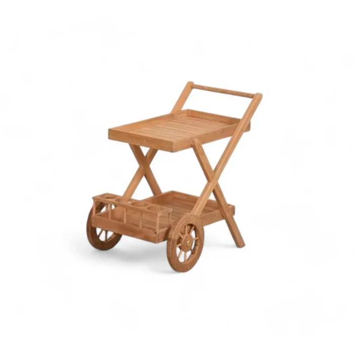 Durable and stylish teak wood serving trolley with two tiers and foldable design. Perfect for indoor and outdoor entertaining.