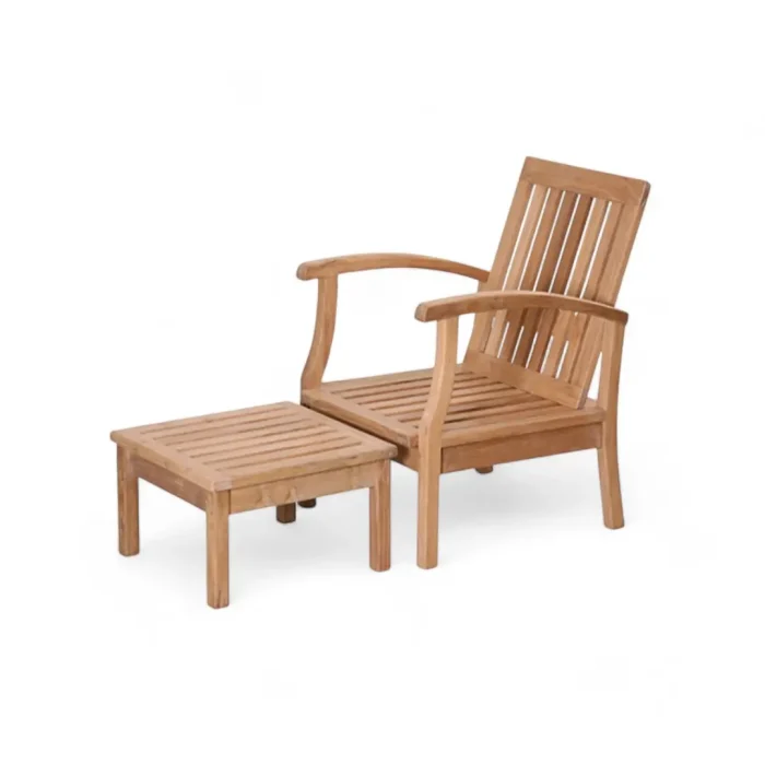 Elegant and comfortable teak wood armchair and footstool set. Perfect for indoor and outdoor use. Durable construction and slatted design for added comfort.