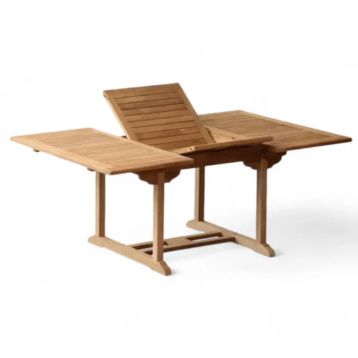 Double drop leaf dining table in teak wood. Extends to seat larger groups. Durable and weather-resistant. Suitable for indoor and outdoor use.