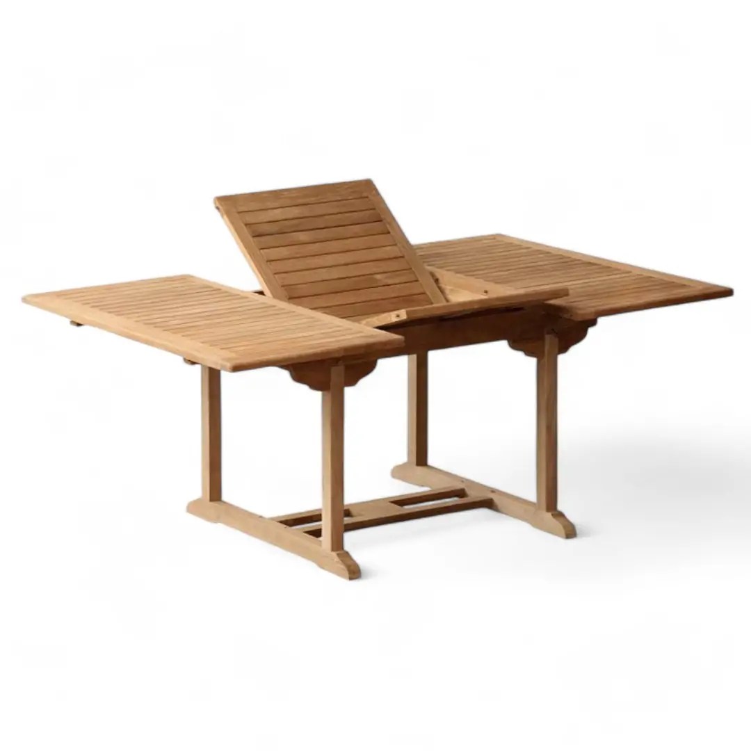 Extendable teak wood dining table with double drop leaves. Seats up to 6 people. Durable and weather-resistant. Ideal for indoor and outdoor use.