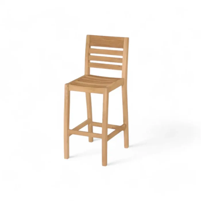 Modern and stylish teak wood bar stool with a slatted back and seat. Durable and comfortable, perfect for indoor and outdoor use.