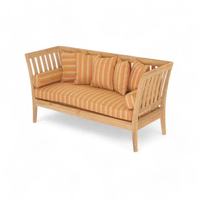 Modern teak wood outdoor sofa with cushions. Durable and weather-resistant. Ideal for patios and outdoor spaces.