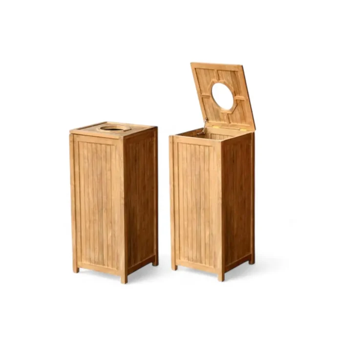 Maintain cleanliness and style in your outdoor space with our Teak Wood Trash Can. Crafted from premium teak wood renowned for its durability and natural weather resistance, this trash can is perfect for patios, gardens, pool areas, or any outdoor setting. The classic design features a hinged lid with a cutout for easy waste disposal, and the spacious interior accommodates a standard trash bag. The slatted construction adds visual interest while promoting ventilation. This teak wood trash can offers a blend of functionality and elegance, keeping your outdoor area tidy and stylish.