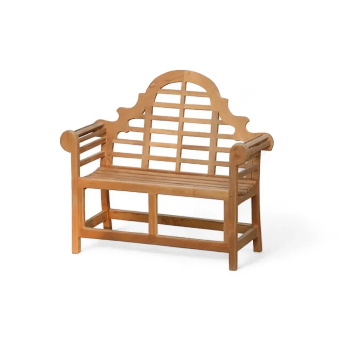 Teak wood bench with a distinctive high back and lattice design. Durable and weather-resistant. Ideal for gardens and patios.