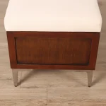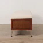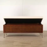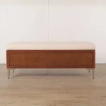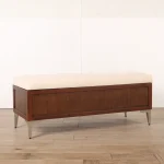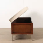 A stylish mid-century modern wooden storage bench featuring a comfortable beige cushion and integrated hidden storage for modern interiors.